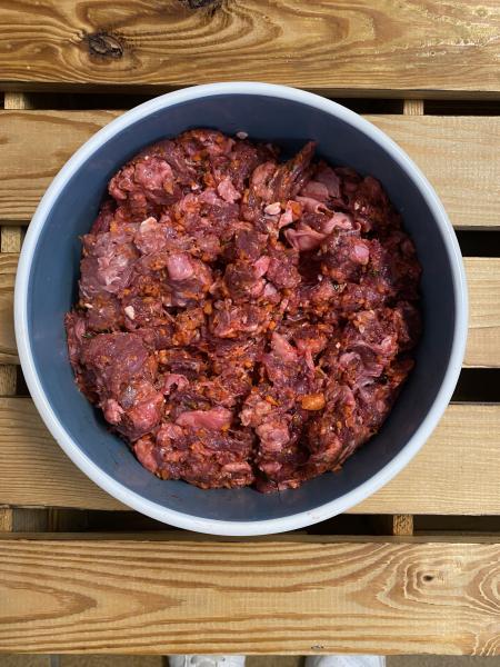 Eine ausgewogene Rohfütterung für Hunde und Katzen (BARF) sollte aus verschiedenen Zutaten wie Fleisch, Innereien, Knochen, Gemüse, Obst und gelegentlich Fisch bestehen.