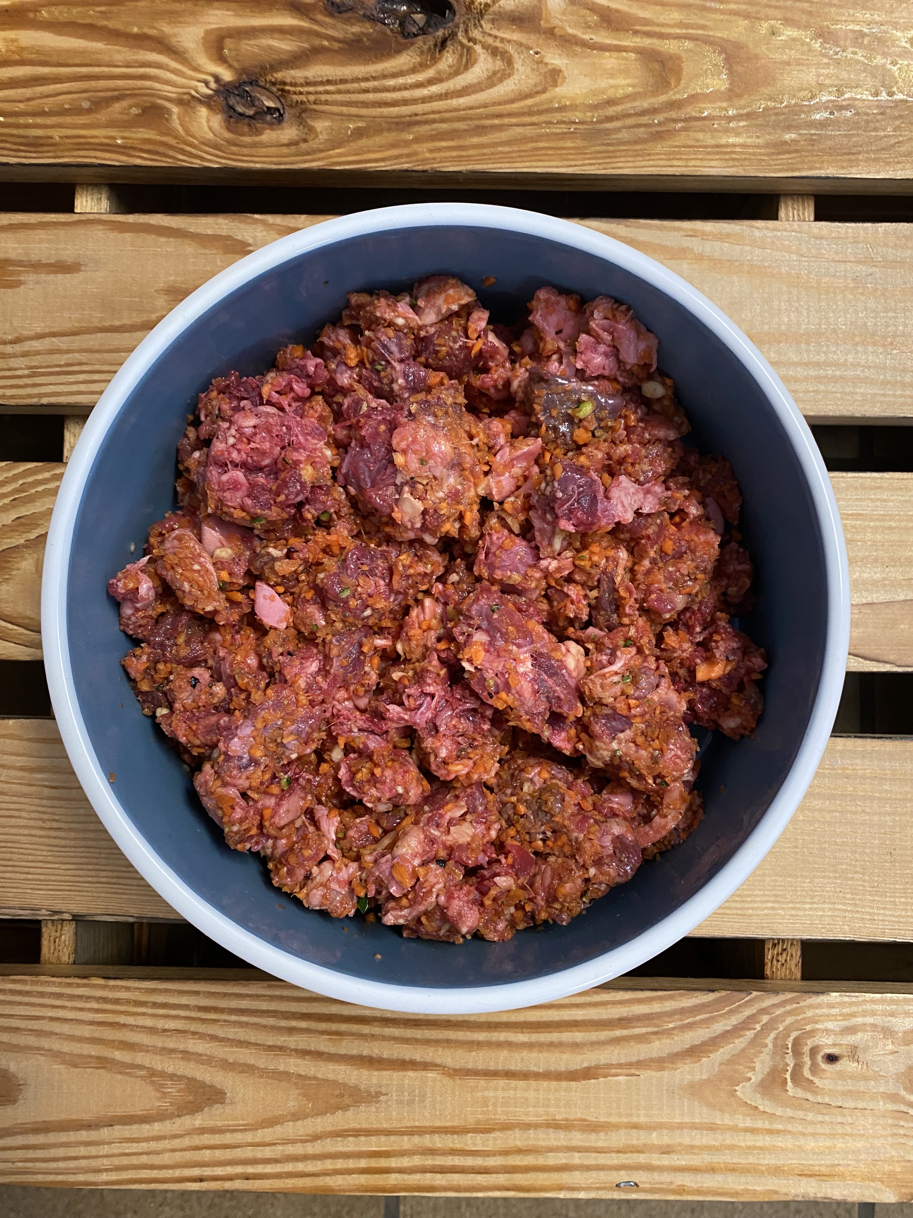 Diese ausgewogene Mischung vereint bestes Rindermuskelfleisch (80%) mit einer farbenfrohen Vielfalt an frischem Gemüse wie Möhren, Zucchini, Eisbergsalat und Sellerie. Ergänzt wird die Rezeptur durch fruchtige Noten von Apfel und Heidelbeeren, die nicht nur den Geschmack verfeinern, sondern auch wertvolle Vitamine liefern.